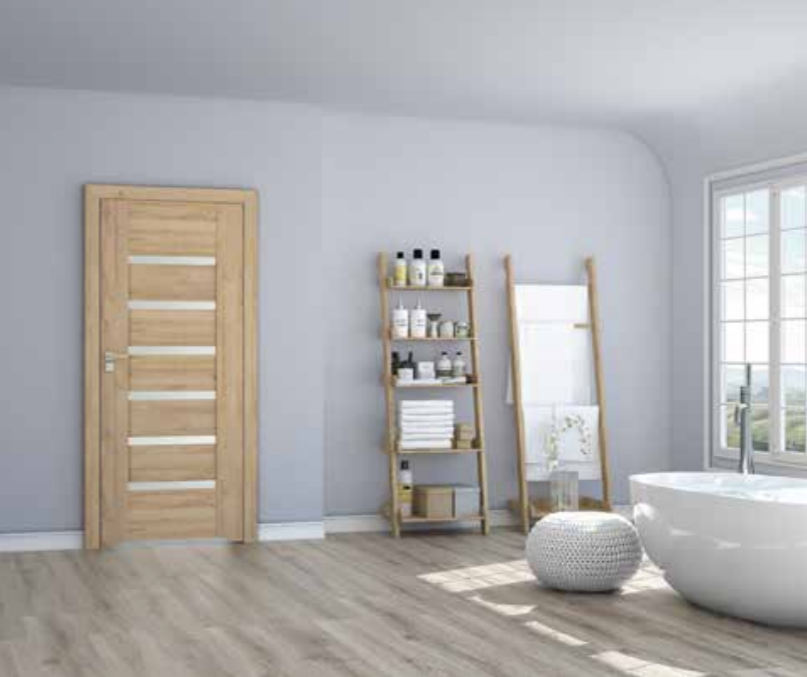 - Durys be užlaidos, magnetine spyna, paslėpti „Estetic 80“ vyriai (vyriai yra durų staktos įrangos dalis)
