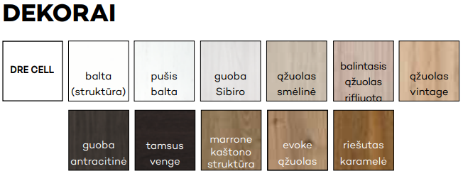 - Varčios rėmai iš medienos. Stiklintos MAT DRE 4mm stiklu (be priemokos galima rinktis DECORMAT rudą, grafito spalvos arba skaidrų stiklą). Laminuotos DRE CELL dekoru