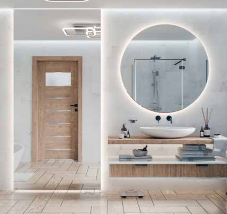 - Durys be užlaidos, magnetine spyna, paslėpti „Estetic 80“ vyriai (vyriai yra durų staktos įrangos dalis)