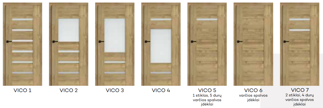 - Varčios rėmai iš medienos. Stiklintos MAT DRE 4mm stiklu (be priemokos galima rinktis DECORMAT rudą, grafito spalvos arba skaidrų stiklą) arba vietoj stiklo 4mm storio užpildas varčios spalvos. Be priemokos modeliuose Vico 1, 5, 7 vietoj stiklintos vietos galima pasirinkti juodos blizgiai dažytos plokštės užpildą
