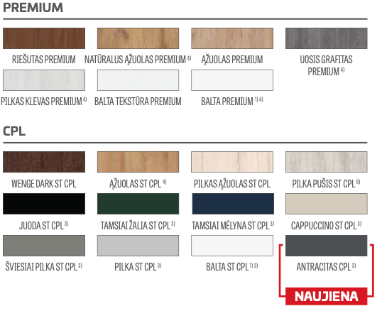 - Klijuotos medienos vertikalūs rėmai su BALTA PREMIUM, NATŪRALAUS ĄŽUOLO PREMIUM, UOSIO GRAFITO PREMIUM, PILKO KLEVO PREMIUM, ĄŽUOLO ST CPL dekoru.