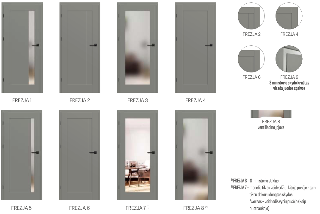 - Klijuotas saugus, lygus iš abiejų pusių VSG 221 stiklas. Matinis arba juodos spalvos. (Netaikoma Frezja 7, 8)