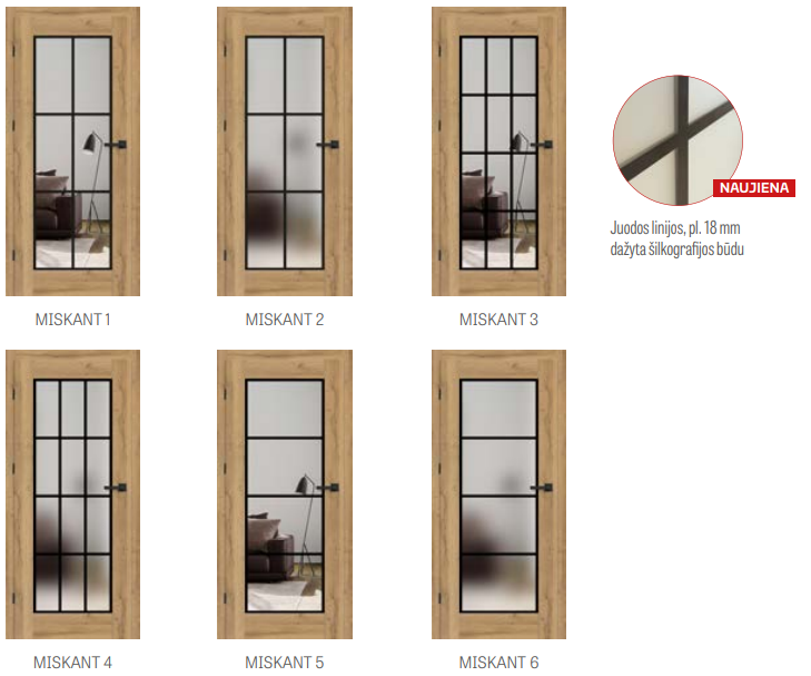 - Standartiškai matinis (Miskant 2, 4, 6) arba skaidrus (Miskant 1, 3, 5) 4mm grūdintas stiklas (yra galimybė pakeisti stiklinimo pusę į REVERSĄ, standartiškai AVERSAS). Juodos 18mm pločio (storio) linijos, dažytos ant vienos stiklo paketo pusės.